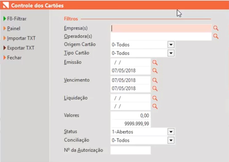 Passos: Retaguarda > Financeiro > Controle de Cartões >Inserir empresa > Inserir operadora > Origem Cartão > Tipo Cartão > Inserir datas > F8-Filtrar