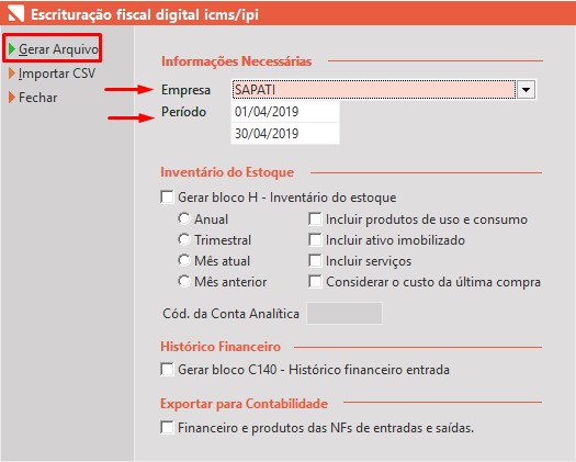 Passo 1. Módulo Retaguarda > Menu Fiscal > Escritura Fiscal Digital (EFD) > Informar a empresa > Informar o período > Gerar arquivo
