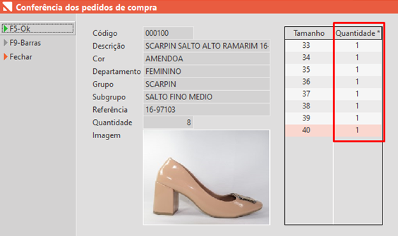 Será aberta a tela de conferência e nela você deve informar manualmente na tabela, a Quantidade que chegou de cada Tamanho. Após adicionar as quantidades você pode clicar em F5-Ok.