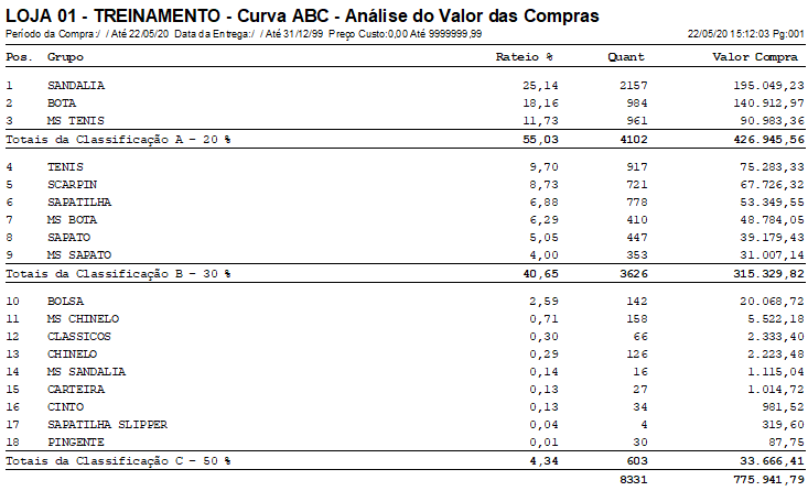 O relatório de curva ABC também conhecida como 80-20, utiliza a metodologia baseada na Teoria de Pareto, que afirma que 80% dos resultados provêm de 20% das causas, ou seja, 80% do seu faturamento ou lucratividade vem de 20% dos produtos vendidos. Assim, o relatório segmenta os itens em três grupos A, B e C, de acordo com o seu grau de importância para a empresa, sob o ponto de vista econômico-financeiro, sendo que: