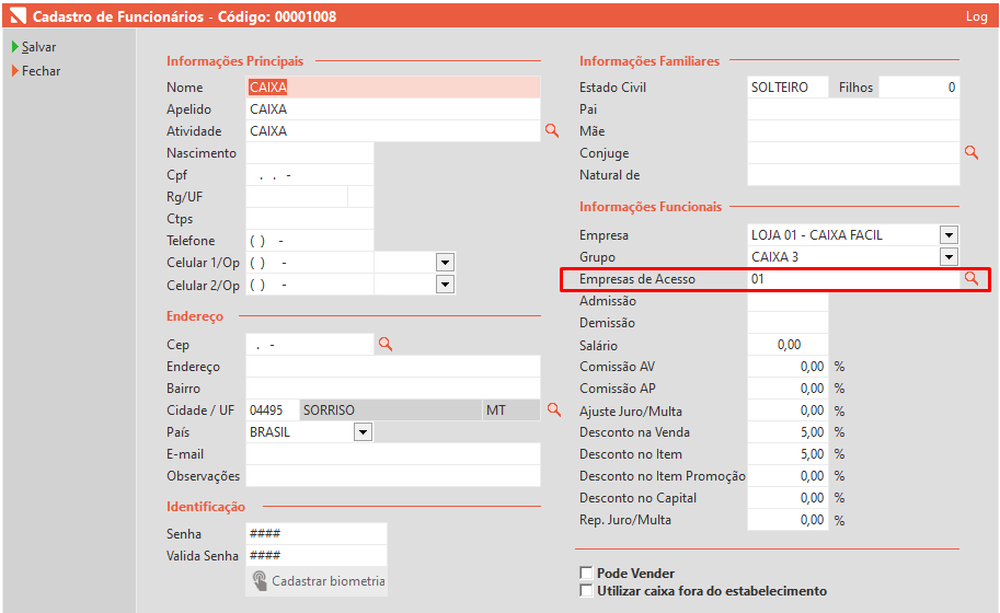 Outra informação importante é de quais empresas o usuário irá visualizar as vendas. Isso é determinado em Módulo Retaguarda, menu Cadastros, Funcionários, no campo do cadastro de funcionários EMPRESAS DE ACESSO.